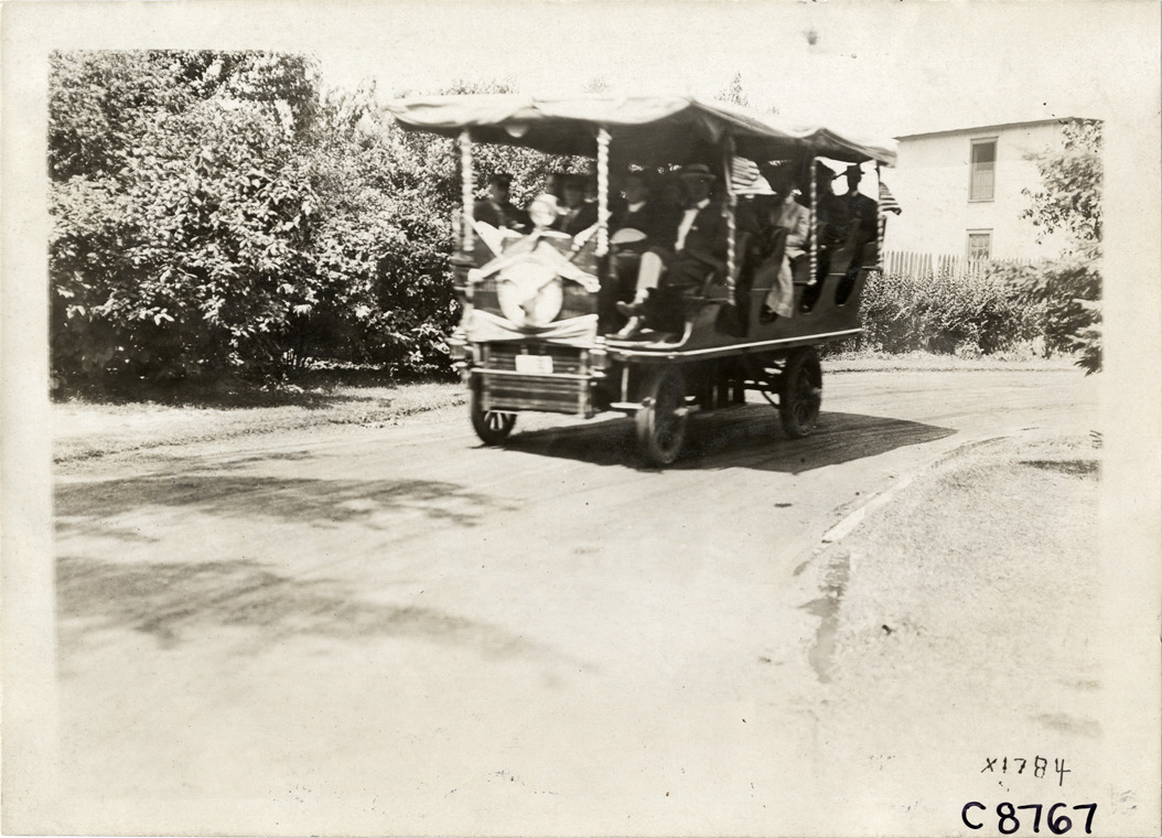 View of jitney decorated for parade during Elks Club convention in Detroit, Michigan. Stamped on back: "Spooner & Wells, Inc., photographers, telephone North 1745. 1231 Woodward Ave., Detroit, Mich. Detroit, 1231 Woodward, New York, 1931 Broadway." Handwritten on back: "Conventions--Elks Club Convention, 1910. At Detroit."