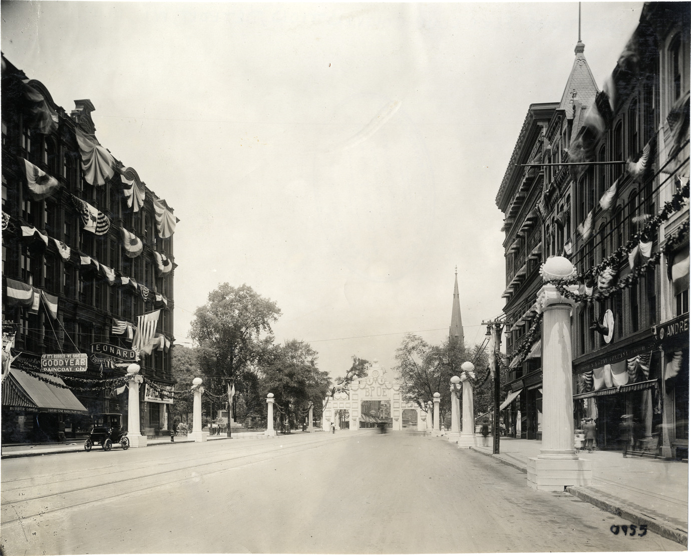 View of decorative arch for Elks Club convention at Grand Circus Park in Detroit, Michigan. Arch spans width of street and is decorated with statues of elk, garlands, clock and "B.P.O.E." Stamped on back: "Spooner & Wells, Inc., photographers, telephone North 1745. 1231 Woodward Ave., Detroit, Mich. Detroit, 1231 Woodward, New York, 1931 Broadway." Handwritten on back: "Conventions--Elks Club Convention, Detroit, Mi., 1910. Grand Circus Park."
