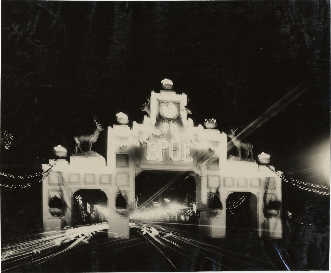 Nighttime view of illuminated decorative arch for Elks Club convention in Detroit, Michigan. Arch spans width of street and is decorated with statues of elk, garlands, clock and "B.P.O.E." Handwritten on back: "Conventions--Elks Club Convention, Detroit, Mi., 1910."