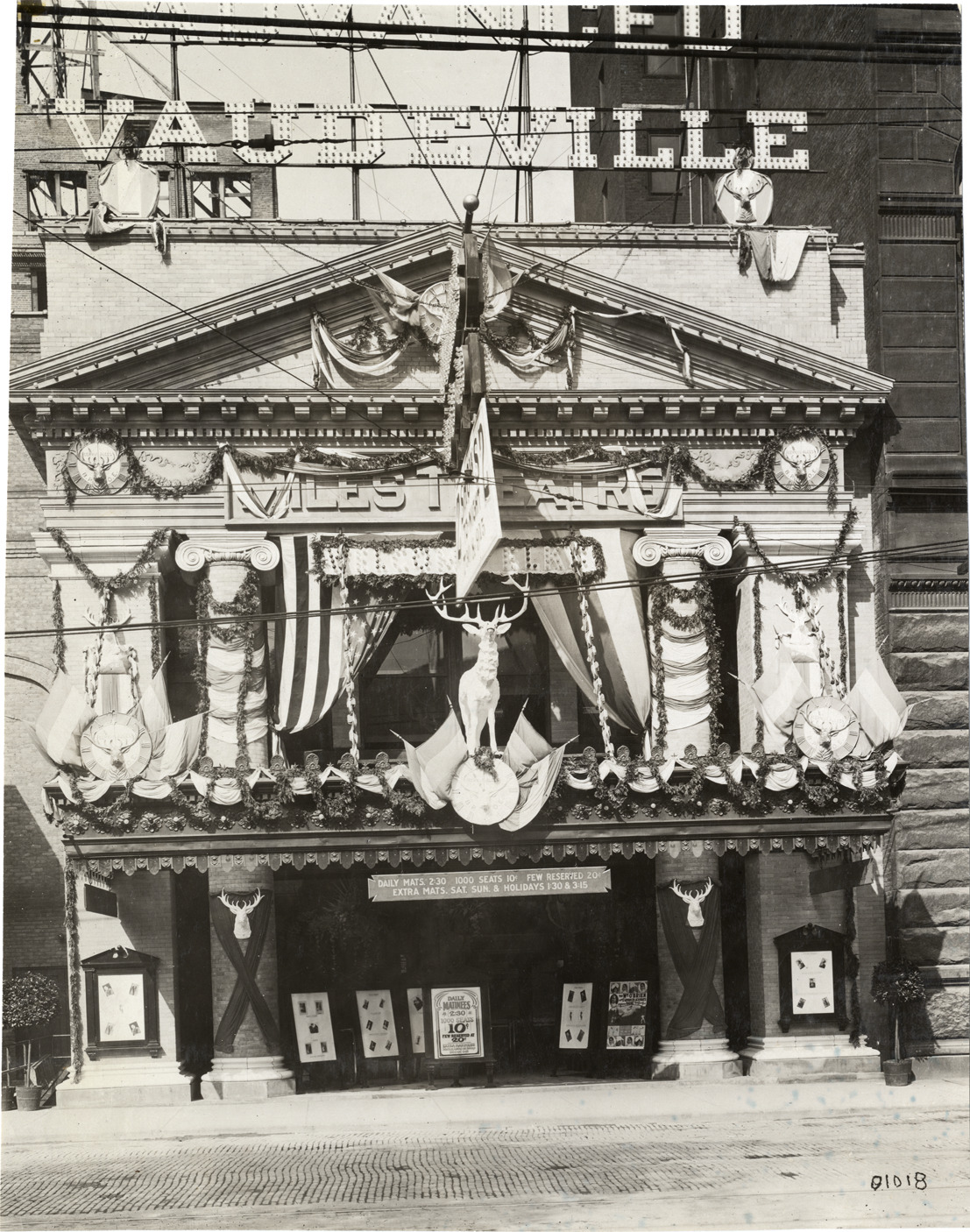 View of Miles Theatre decorated for Elks Club convention in Detroit, Michigan. Building facade is decorated with bunting, garlands, flags, medallions and statues of elk. Handwritten on back: "Conventions--Elks Club Convention, Detroit, Mi., 1910."
