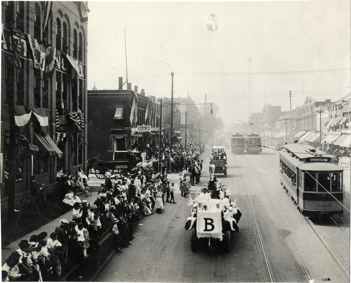 View of cars in parade on Woodward Ave. during Elks Club convention in Detroit, Michigan. Streetcars in background; spectators watch from sidewalks. Stamped on back: "Spooner & Wells, Inc., photographers, telephone North 1745. 1231 Woodward Ave., Detroit, Mich. Detroit, 1231 Woodward, New York, 1931 Broadway." Handwritten on back: "Conventions--Elks Club Convention, Detroit, Mi., 1910."