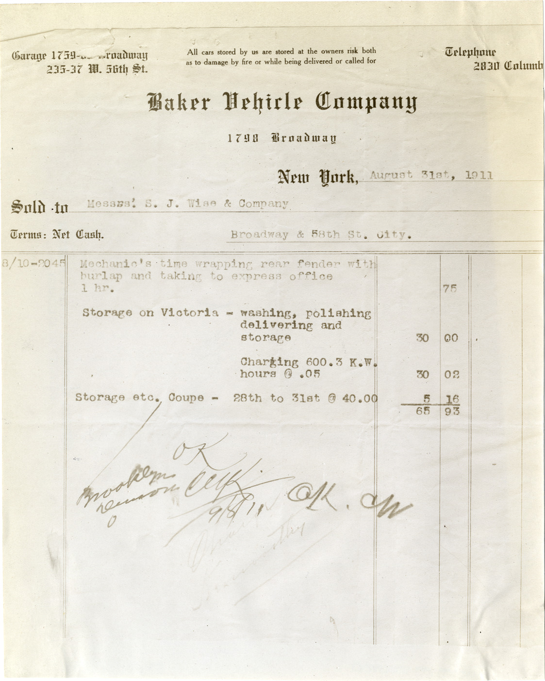 Favorite this☆ Baker Vehicle Company invoice Description: Photograph of invoice from Baker Vehicle Company issued to S.J. Wise & Company for labor and vehicle storage. Handwritten on back: "Correspondence, 1911." Details Resource ID: na006195 Subject: Baker Vehicle Company Electric automobiles--Maintenance and repair Invoices Photographic prints Date Issued: 1911-08-31 Format: 1 photographic print ; 9.5 x 7.5 in. Member of: National Automotive History Collection Lazarnick Collection Filing Location: Correspondence Rights: Physical rights are retained by DPL. Copyright is retained in accordance with U.S. copyright laws.