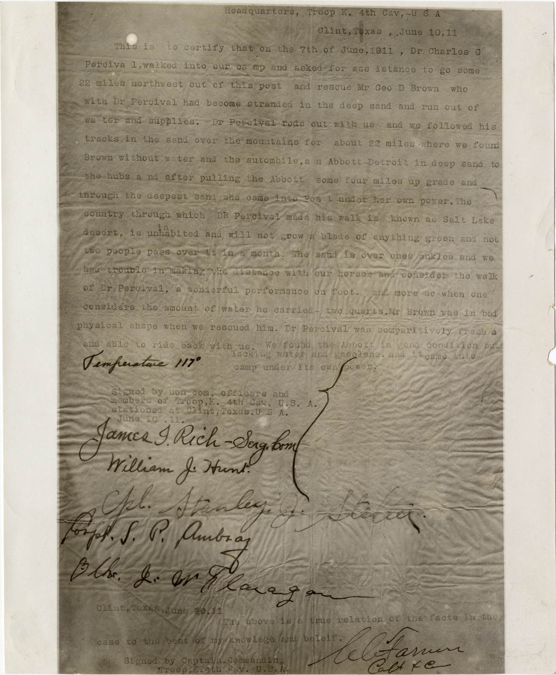 Favorite this☆ Report from Troop K, 4th U.S. Cavalry Description: Photograph of report from Troop K, 4th U.S. Cavalry stationed at Clint, Texas. Report describes rescue of Dr. George D. Brown, who was stranded with an Abbott-Detroit car in the Salt Lake Desert. Handwritten on back: "Correspondence, 1911." Details Resource ID: na006198 Subject: United States. Army. Cavalry, 4th Rescues--Texas Abbott Motor Company Photographic prints Date Issued: 1911-06-10 Format: 1 photographic print ; 9.25 x 7.5 in. Member of: National Automotive History Collection Lazarnick Collection Filing Location: Correspondence Rights: Physical rights are retained by DPL. Copyright is retained in accordance with U.S. copyright laws.