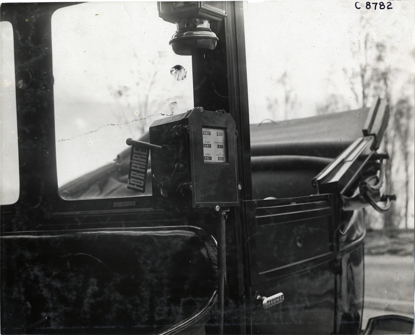 Favorite this☆ 1908 Darracq taximeter Description: View of 1908 Darracq taximeter; "For hire" flag on meter. Handwritten on back: "Darracq taxicab, 1908." Details Resource ID: na006229 Subject: Taximeters Taxicabs A. Darracq and Company Photographic prints Date Issued: Unknown year Format: 1 photographic print ; 7.75 x 9.5 in. Member of: National Automotive History Collection Lazarnick Collection Filing Location: Darracq Negative Number: Negative #C8782 Rights: Physical rights are retained by DPL. Copyright is retained in accordance with U.S. copyright laws.