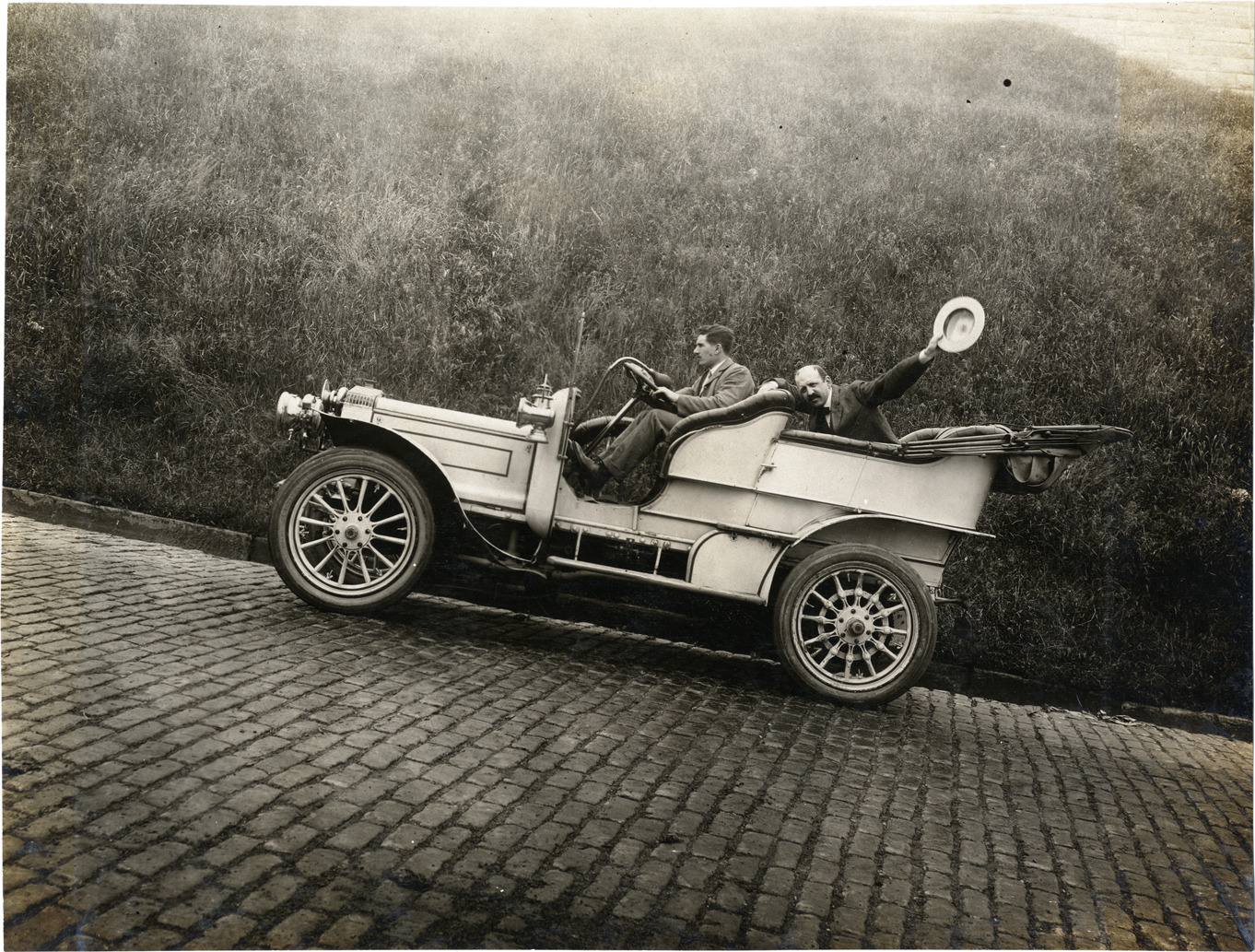 View of two men in 1906 Daimler car, traveling uphill. Stamped on back: "F. Ed. Spooner, and Chas. S. Wells. Motor News, Motor Photos, Motor Adv, 1536 B'way, New York. Tel 6536-38th St." Handwritten on back: "Daimler, 1906."