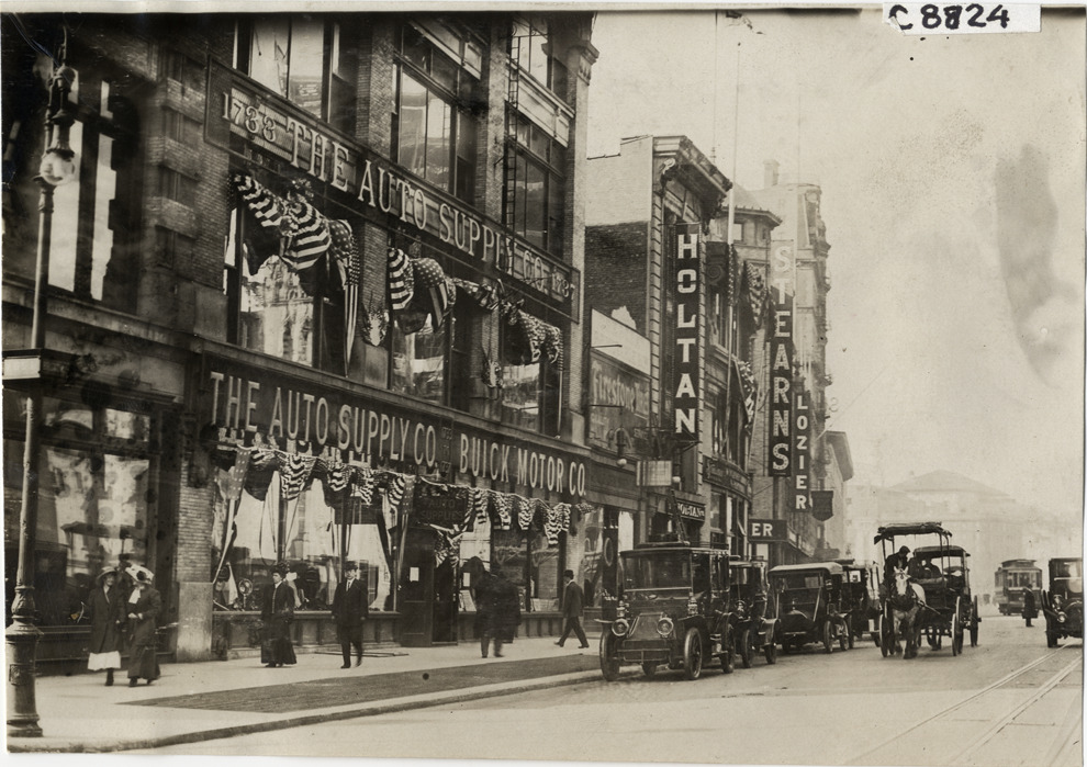 View of Auto Supply Company building; signs for Buick Motor Co., Hol-Tan, Stearns and Lozier in background. Cars parked on street. Stamped on back: "Spooner & Wells, Inc., photographers, telephones 3472-3473 Columbus, 1931 Broadway, New York." Handwritten on back: "Dealerships--Hol-Tan, 1909."
