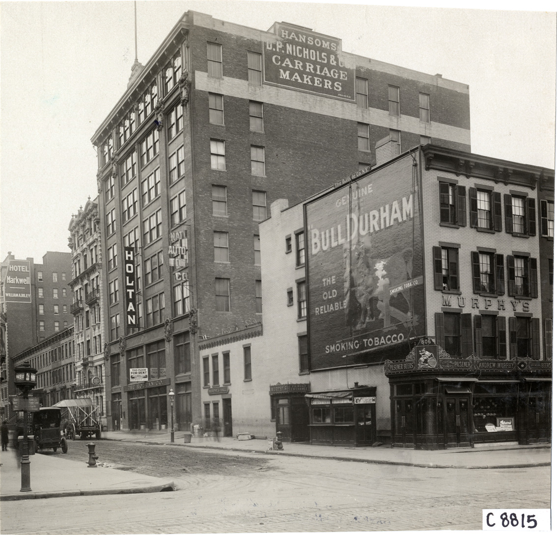Front and side view of Hol-Tan Company building. Andrew Murphy saloon on corner; advertisement for Bull Durham smoking tobacco on building. Wall sign near top of Hol-Tan building: "Hansoms, D.P. Nichols & Co. carriage makers." Handwritten on back: "Dealerships--Hol-Tan, 1908."