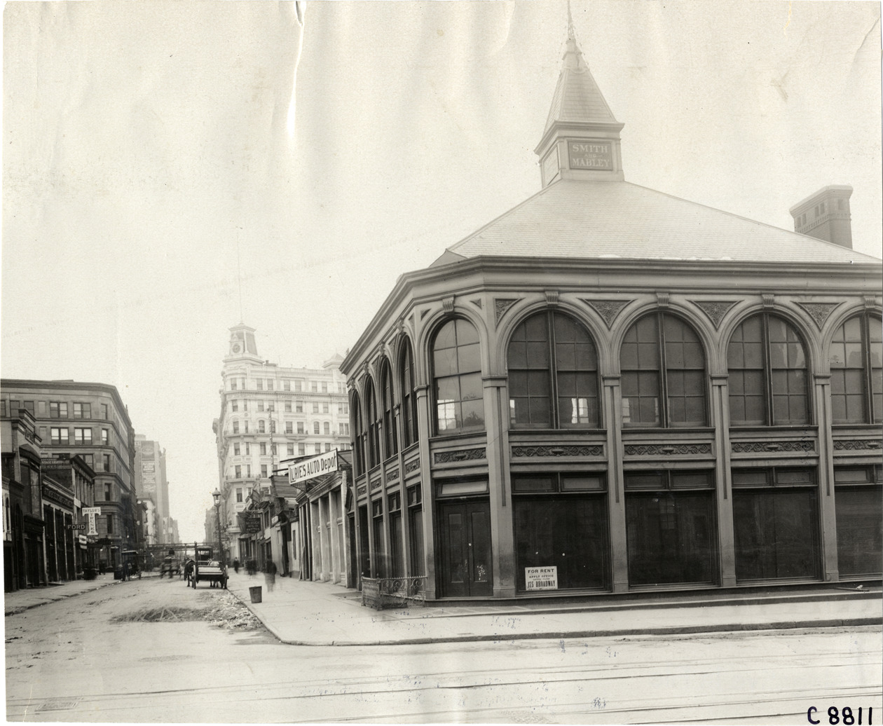 Corner view of Smith & Mabley Manufacturing Company salesroom with "For rent" sign in window. Building has arched windows, hipped roof and steeple. Lurie's Auto Depot adjacent to building in background. Handwritten on back: "Dealerships--Smith & Mabley, 1908."