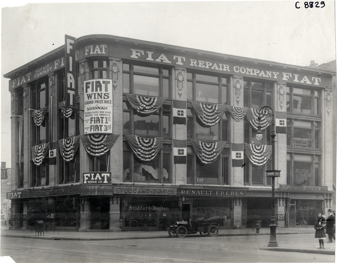 View of car parked in front of Fiat Repair Company building, decorated with bunting. Sign on corner of building: "Fiat wins Grand Prize Race at Savannah, establishing new road record for America; Wagner in Fiat, 1st; Nazzaro in Fiat, 3rd." Stoddard-Dayton automobile dealership on ground level. Handwritten on back: "Dealerships--Fiat, 1908."