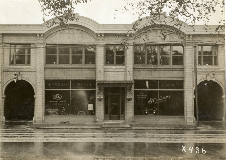 View of Century Motor Sales Company and Palmer Auto Company building. Signs in windows: "Reo motor cars, Thomas flyer, Stearns, the ultimate car." Handwritten on back: "Dealerships--Stearns, 1910."