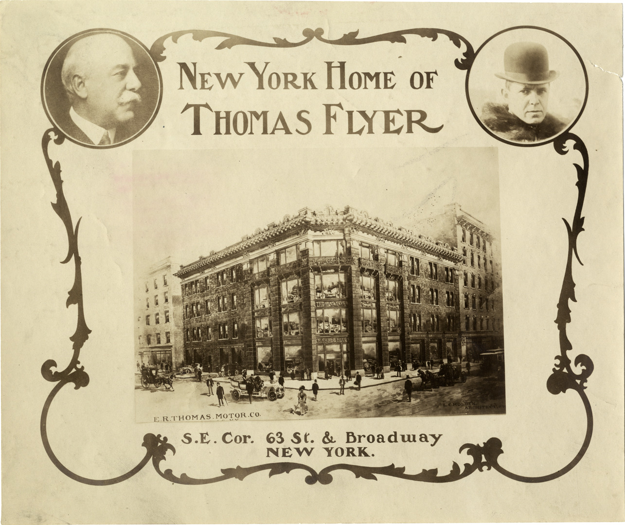 Artist's depiction of E.R. Thomas Motor Company building with inset portraits of two men. Printed on front: "New York home of Thomas Flyer, E.R. Thomas Motor Co., S.E. corner 63 St. & Broadway, New York." Handwritten on back: "Dealerships--E.R. Thomas Motor Co., 1906."