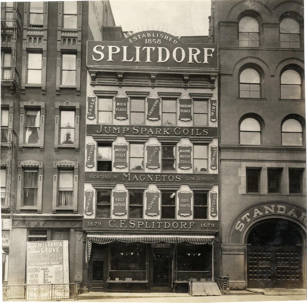 Favorite this☆ C.F. Splitdorf building Description: View of C.F. Splitdorf building. Signs on building: "Splitdorf, established 1858, jump spark coils, high tension magnetos, low tension." Handwritten on back: "Dealerships--Splitdorf magnetos, 1906." Details Resource ID: na006325 Subject: Automobile supplies industry--New York (State)--New York Commercial buildings--New York (State)--New York Photographic prints Date Issued: 1906 Format: 1 photographic print ; 7 x 7.25 in. Member of: National Automotive History Collection Lazarnick Collection Filing Location: Dealerships #4 Rights: Physical rights are retained by DPL. Copyright is retained in accordance with U.S. copyright laws.