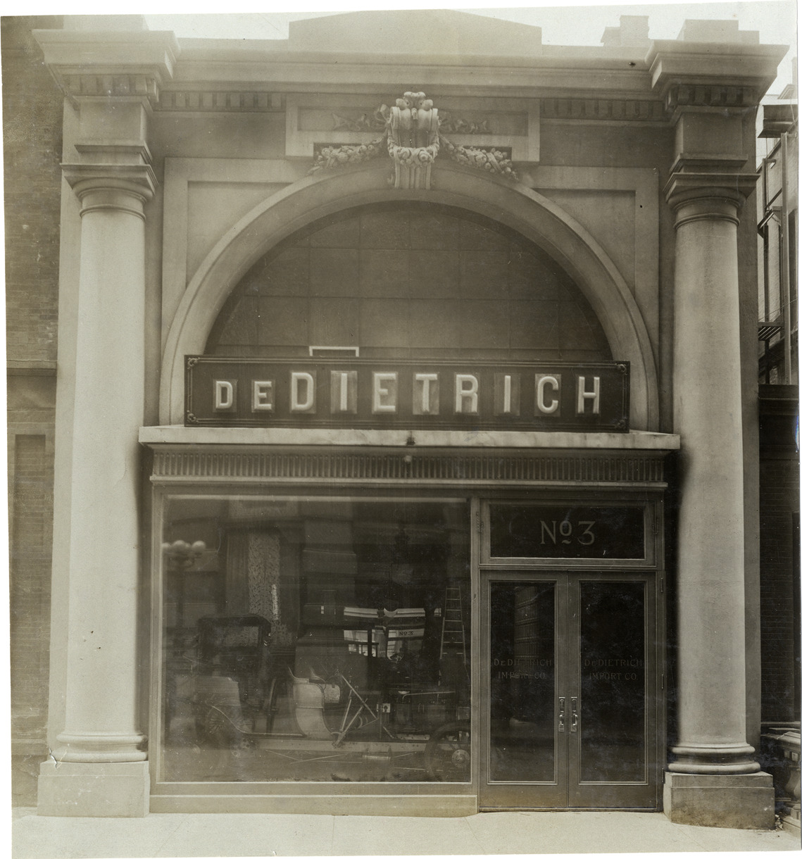Favorite this☆ De Dietrich Import Company building Description: View of De Dietrich Import Company building, with cars visible through showroom windows. Stamped on back: "Photo by F. Ed. Spooner, 1536 B'way, telephone 6536-38th St., New York, N.Y." Handwritten on back: "Dealerships--De Dietrich, 1906." Details Resource ID: na006326 Creator: Spooner, F. Ed. Subject: Automobile dealers--New York (State)--New York Commercial buildings--New York (State)--New York De Dietrich (Firm) Photographers--New York (State)--New York Photographic prints Date Issued: 1906 Format: 1 photographic print ; 8 x 7.5 in. Member of: National Automotive History Collection Lazarnick Collection Filing Location: Dealerships #4 Rights: Physical rights are retained by DPL. Copyright is retained in accordance with U.S. copyright laws.