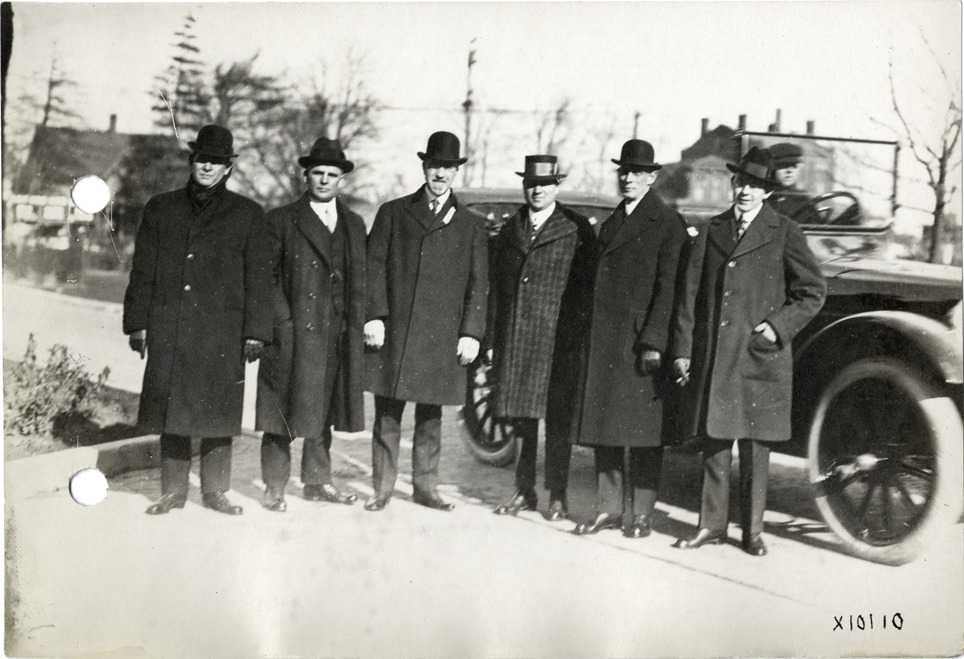 View of group of men posing in front of automobile at Chalmers Motor Company sales convention. Handwritten on back: "Dealerships--Chalmers, 1915. Taken for Chalmers Motor Co. convention, Nov. 15, 16 & 17, 1915."