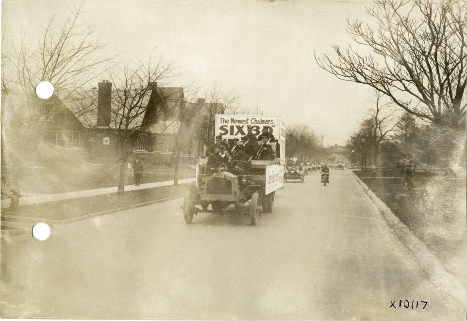 View of musicians playing in Chalmers car in parade during Chalmers Motor Company sales convention. Sign on car reads: "The newest Chalmers Six '30.'" Stamped on back: "Spooner & Wells, Inc., photographers, 1231 Woodward Ave., Detroit, Mich." Handwritten on back: "Dealerships--Chalmers, 1915. Chalmers parade. Taken for Chalmers Motor Co. Convention, Nov. 15, 16 & 17, 1915."