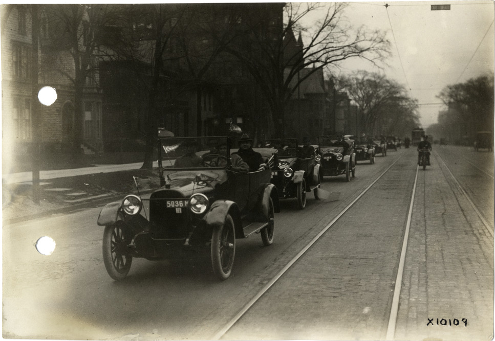 View of Chalmers cars in parade during Chalmers Motor Company sales convention; policeman on motorcycle in background. Stamped on back: "Spooner & Wells, Inc., photographers, 1231 Woodward Ave., Detroit, Mich." Handwritten on back: "Dealerships--Chalmers, 1915. Chalmers parade. Taken for Chalmers Motor Co. Convention, Nov. 15, 16 & 17, 1915."