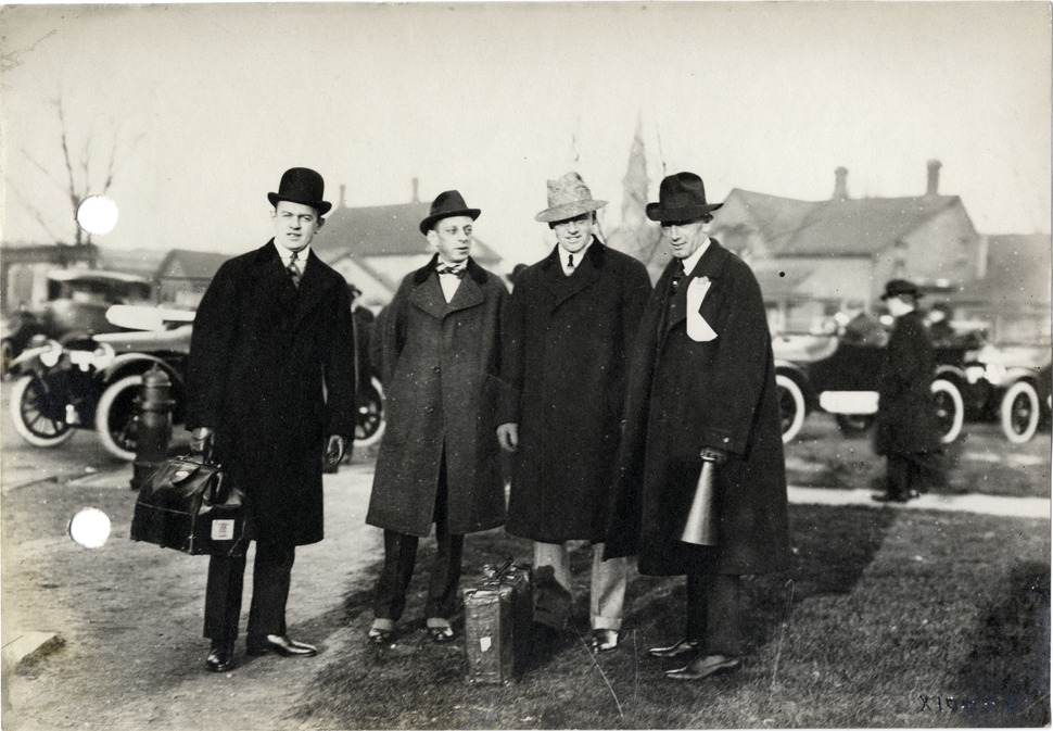 View of four men posing with valise and suitcase at Chalmers Motor Company sales convention. Automobiles in background. Handwritten on back: "Dealerships--Chalmers, 1915. Chalmers dealers. Convention, Nov. 15, 16 & 17, 1915. Taken for Chalmers Motor Co."
