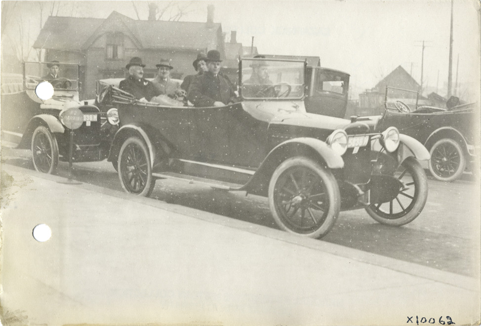 View of group of men in Chalmers car at Chalmers Motor Company sales convention. House in background. Handwritten on back: "Dealerships--Chalmers, 1915. Chalmers dealers. Convention, Nov. 15, 16 & 17, 1915. Taken for Chalmers Motor Co."