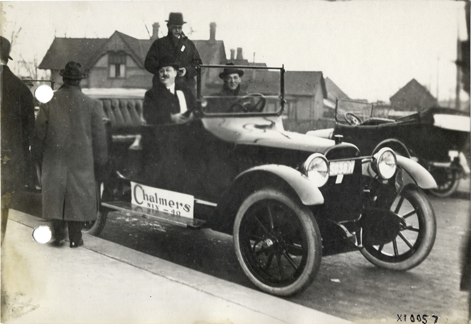 View of men in Chalmers Six-40 car during Chalmers Motor Company sales convention. Sign on car reads: "Chalmers, Six-40." Handwritten on back: "Dealerships--Chalmers, 1915. Chalmers dealers. Convention, Nov. 15, 16 & 17, 1915. Taken for Chalmers Motor Co."