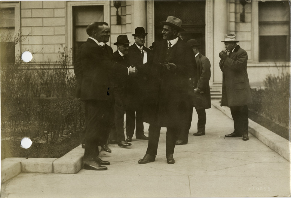 View of several men at Chalmers Motor Company sales convention; two men in foreground shake hands. Stone building in background. Handwritten on back: "Dealerships--Chalmers, 1915. Chalmers dealers. Convention, Nov. 15, 16 & 17, 1915. Taken for Chalmers Motor Co."