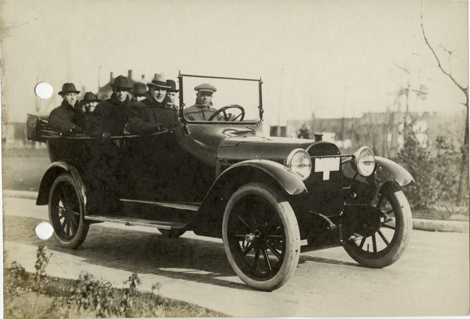 View of men in Chalmers car during Chalmers Motor Company sales convention. Handwritten on back: "Dealerships--Chalmers, 1915. Chalmers dealers. Convention, Nov. 15, 16 & 17, 1915. Taken for Chalmers Motor Co."