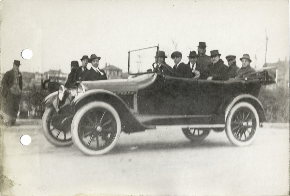 View of men in Chalmers car during Chalmers Motor Company sales convention. Handwritten on back: "Dealerships--Chalmers, 1915. Chalmers dealers. Convention, Nov. 15, 16 & 17, 1915. Taken for Chalmers Motor Co."