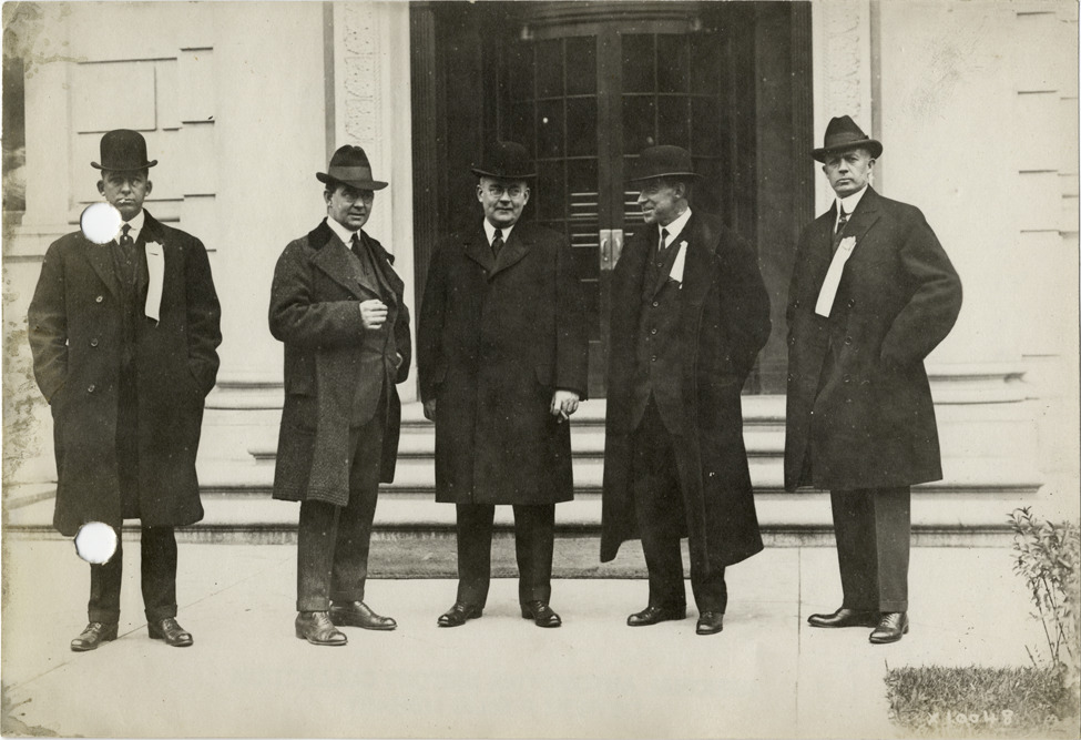 Group portrait of men at Chalmers Motor Company sales convention. Stone building in background. Handwritten on back: "Dealerships--Chalmers, 1915. Chalmers dealers. Convention, Nov. 15, 16 & 17, 1915. Taken for Chalmers Motor Co."