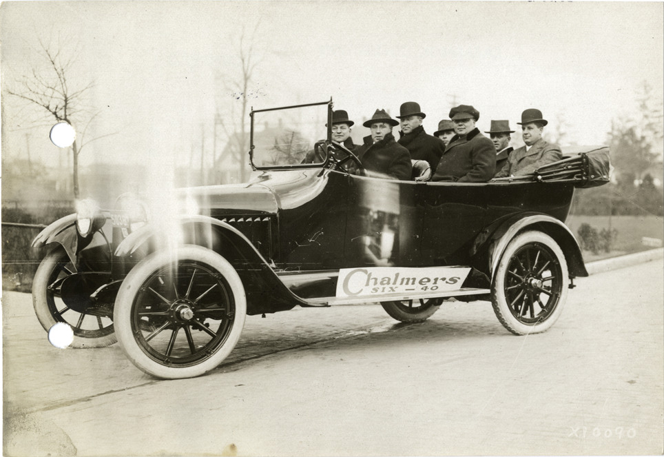 View of men in Chalmers Six-40 car during Chalmers Motor Company sales convention. Sign on car reads: "Chalmers Six-40." Stamped on back: "Spooner & Wells, Inc., photographers, 1231 Woodward Ave., Detroit, Mich." Handwritten on back: "Dealerships--Chalmers, 1915. Chalmers dealers. Convention, Nov. 15, 16 & 17, 1915. Taken for Chalmers Motor Co."