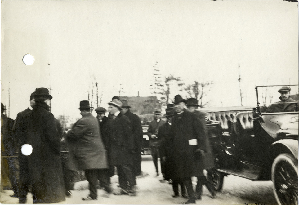 View of men with Chalmers car during Chalmers Motor Company sales convention. Stamped on back: "Spooner & Wells, Inc., photographers, 1231 Woodward Ave., Detroit, Mich." Handwritten on back: "Dealerships--Chalmers, 1915. Chalmers dealers. Convention, Nov. 15, 16 & 17, 1915. Taken for Chalmers Motor Co."