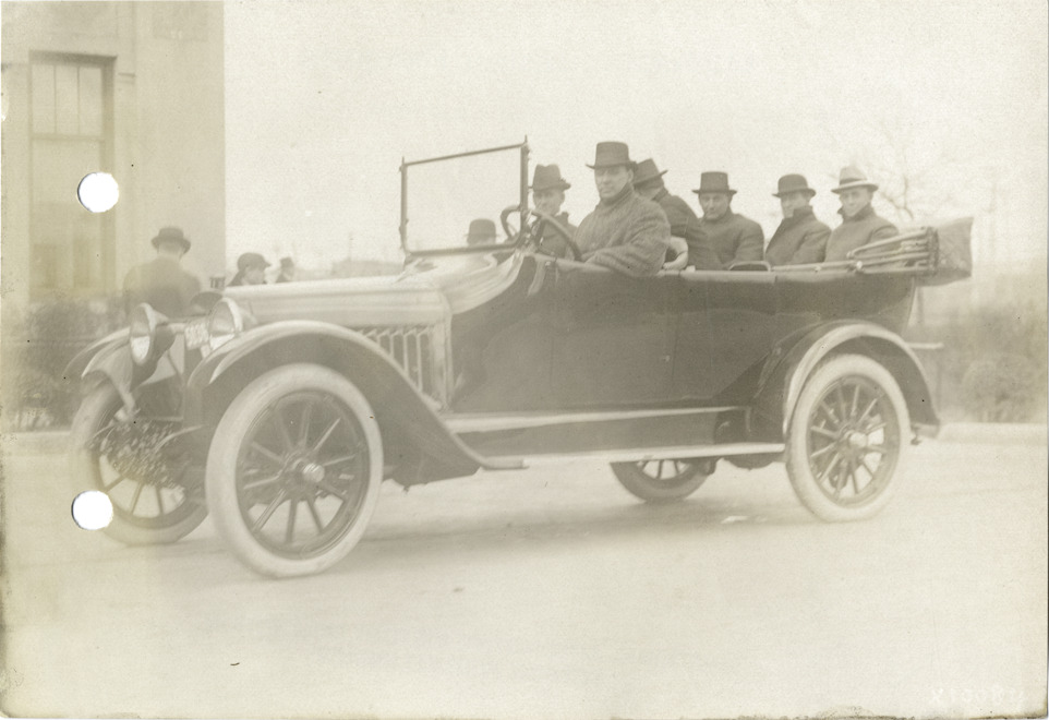 View of men in Chalmers car during Chalmers Motor Company sales convention. Stamped on back: "Spooner & Wells, Inc., photographers, 1231 Woodward Ave., Detroit, Mich." Handwritten on back: "Dealerships--Chalmers, 1915. Chalmers dealers. Convention, Nov. 15, 16 & 17, 1915. Taken for Chalmers Motor Co."