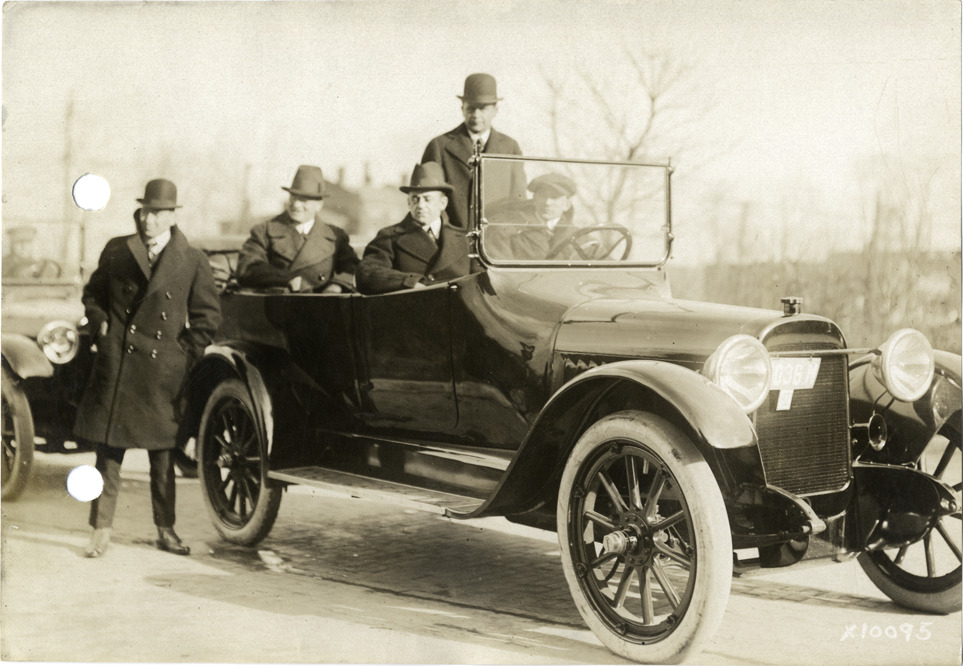 View of men in Chalmers car during Chalmers Motor Company sales convention. Stamped on back: "Spooner & Wells, Inc., photographers, 1231 Woodward Ave., Detroit, Mich." Handwritten on back: "Dealerships--Chalmers, 1915. Chalmers dealers. Convention, Nov. 15, 16 & 17, 1915. Taken for Chalmers Motor Co."