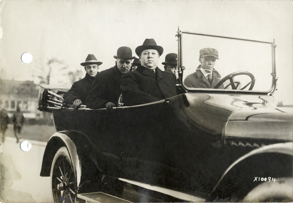 View of men in Chalmers car during Chalmers Motor Company sales convention. Stamped on back: "Spooner & Wells, Inc., photographers, 1231 Woodward Ave., Detroit, Mich." Handwritten on back: "Dealerships--Chalmers, 1915. Chalmers dealers. Convention, Nov. 15, 16 & 17, 1915. Taken for Chalmers Motor Co."