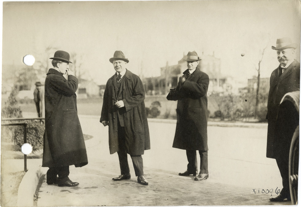 View of group of men at Chalmers Motor Company sales convention; stone building in background. Handwritten on back: "Dealerships--Chalmers, 1915. Chalmers dealers. Convention, Nov. 15, 16 & 17, 1915. Taken for Chalmers Motor Co."