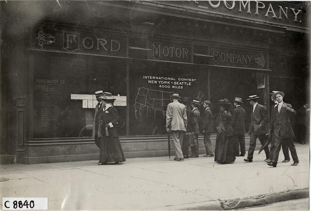 View of group of men and women standing in front of Ford Motor Company dealership, looking at window. Map of United States painted on window with text: "International contest, New York - Seattle, 4000 miles." Stamped on back: "Spooner & Wells, Inc., photographers, telephones 3472-3473 Columbus, 1931 Broadway, New York." Handwritten on back: "Dealerships--Ford Motor Co., 1909."