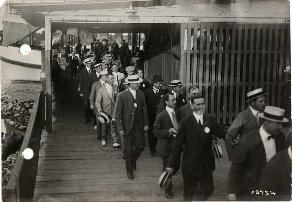 View of group of men leaving ferry during Hupmobile Dealers' Convention. Handwritten on back: "Dealerships--Hupmobile. Hupmobile Dealers' Convention."