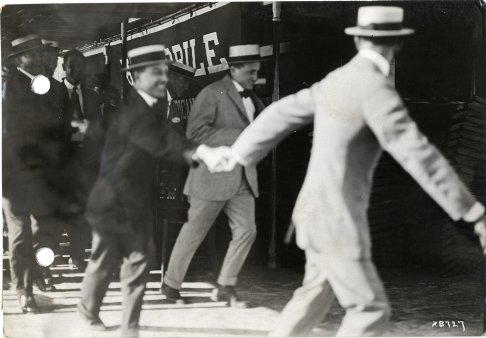 View of men reveling on ferry during Hupmobile Dealers' Convention. Stamped on back: "Spooner & Wells, Inc., photographers, 1231 Woodward Ave., Detroit, Mich." Handwritten on back: "Dealerships--Hupmobile. Hupmobile Dealers' Convention."