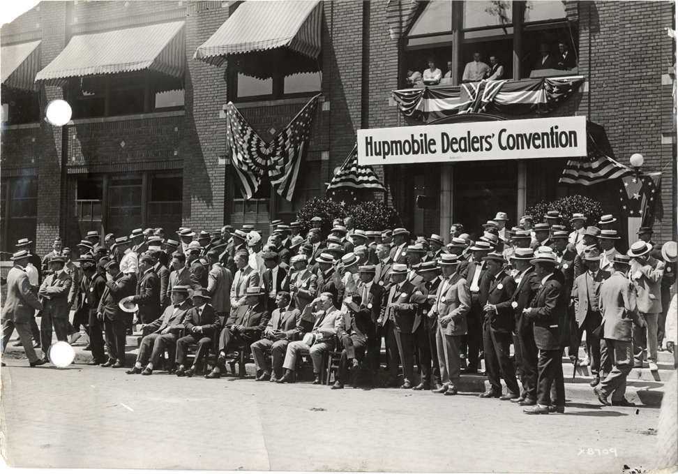 Hupmobile dealers posing in front of Hupp Motor Car Company factory during convention
