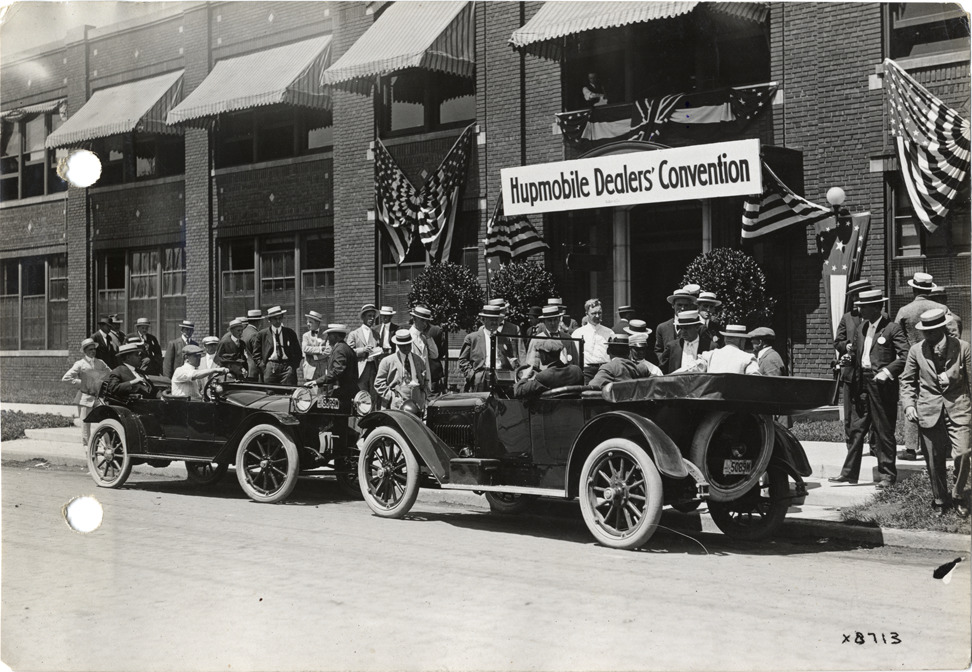 Hupmobile dealers with automobiles in front of Hupp Motor Car Company factory during convention