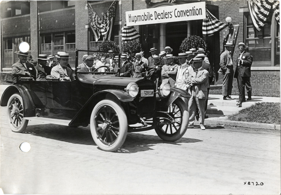 Hupmobile dealers with automobile in front of Hupp Motor Car Company factory during convention
