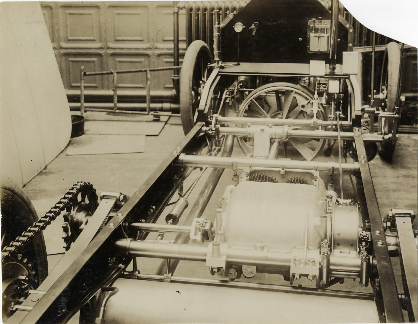 Close-up view of 1906 De Dietrich car chassis. Stamped on back: "Photo by F. Ed. Spooner, 1536 B'way, telephone 6536-38th St., New York, N.Y." Handwritten on back: "De Dietrich, 1906."