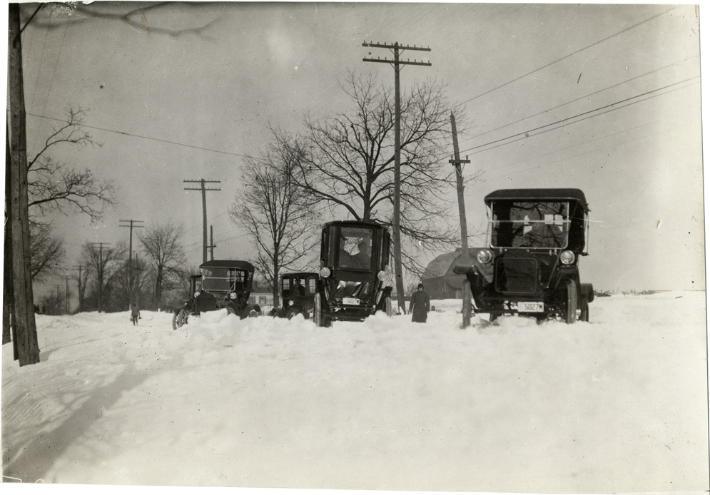 View of four 1910 Detroit Electric automobiles parked on side of snow-covered rural road; barn in background. Stamped on back: "Spooner & Wells, Inc., photographers, telephone North 1745. 1231 Woodward Ave., Detroit, Mich. Detroit, 1231 Woodward, New York, 1931 Broadway." Handwritten on back: "Detroit Electric, 1910."