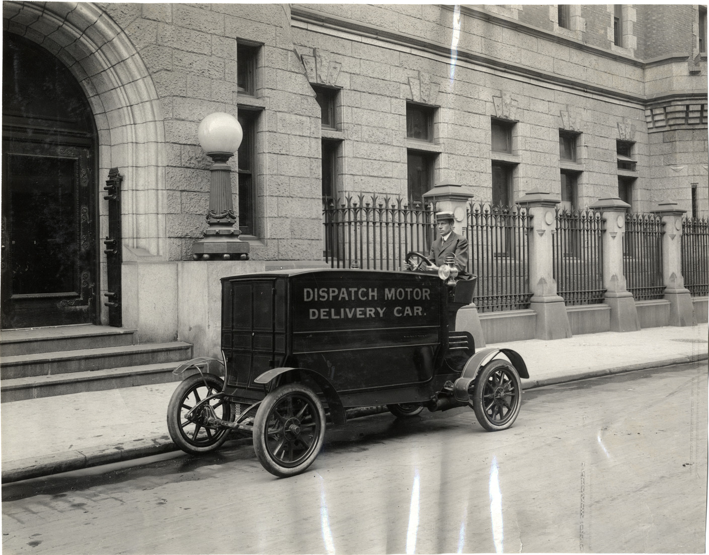 Favorite this☆ 1908 Dispatch delivery car Description: View of man driving 1908 Dispatch delivery car in front of First Battery Armory building. "Dispatch Motor delivery car" painted on side of vehicle. Handwritten on back: "Dispatch delivery car, 1908." Details Resource ID: na006507 Subject: Dispatch Motor Car Company Trucks--New York (State)--New York Delivery of goods--New York (State)--New York Photographic prints Date Issued: Unknown year Format: 1 photographic print ; 7.5 x 9.5 in. Member of: National Automotive History Collection Lazarnick Collection Filing Location: Dispatch delivery car Rights: Physical rights are retained by DPL. Copyright is retained in accordance with U.S. copyright laws.