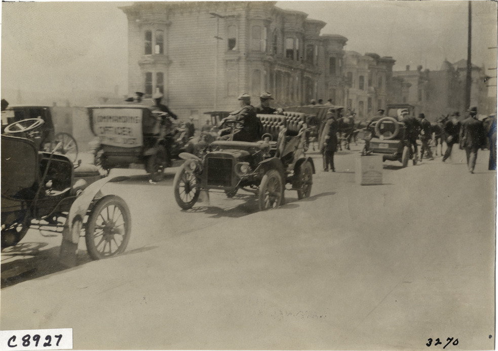 Automobiles in street, 1906 San Francisco earthquake and fire