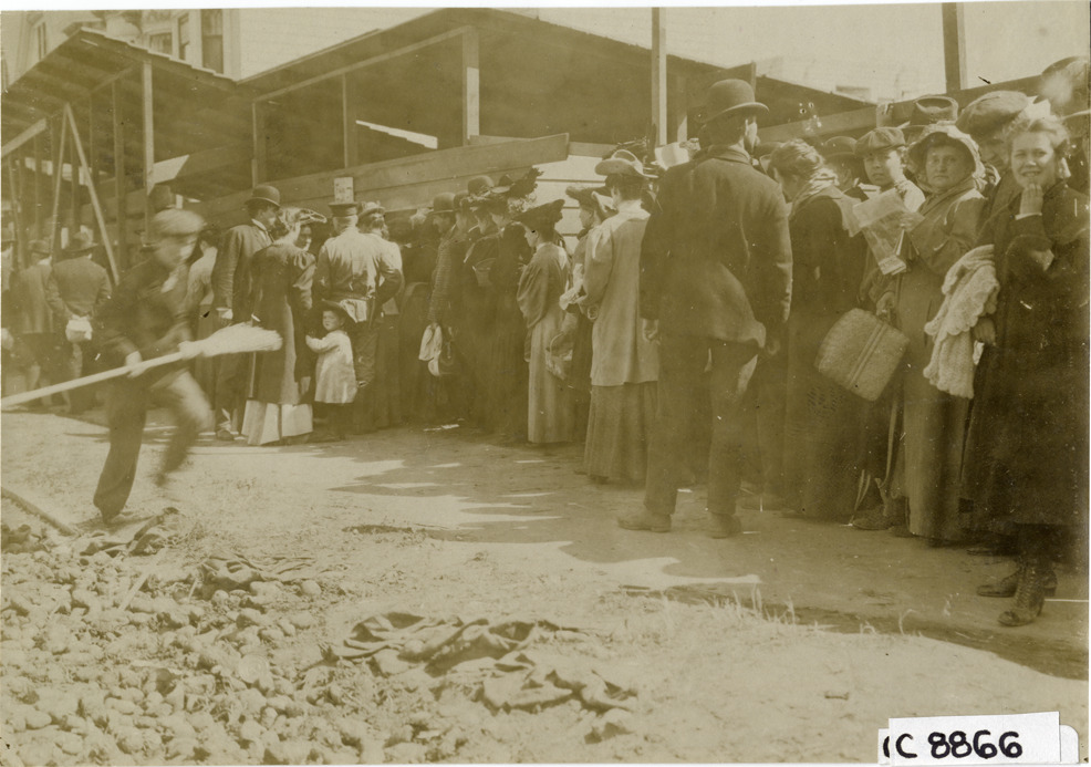 Queue of men and women waiting for meat, 1906 San Francisco earthquake and fire