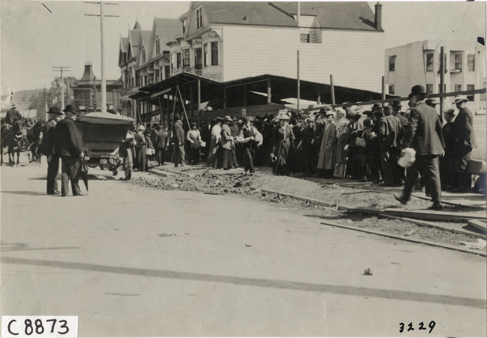 Queue of men and women on sidewalk, 1906 San Francisco earthquake and fire