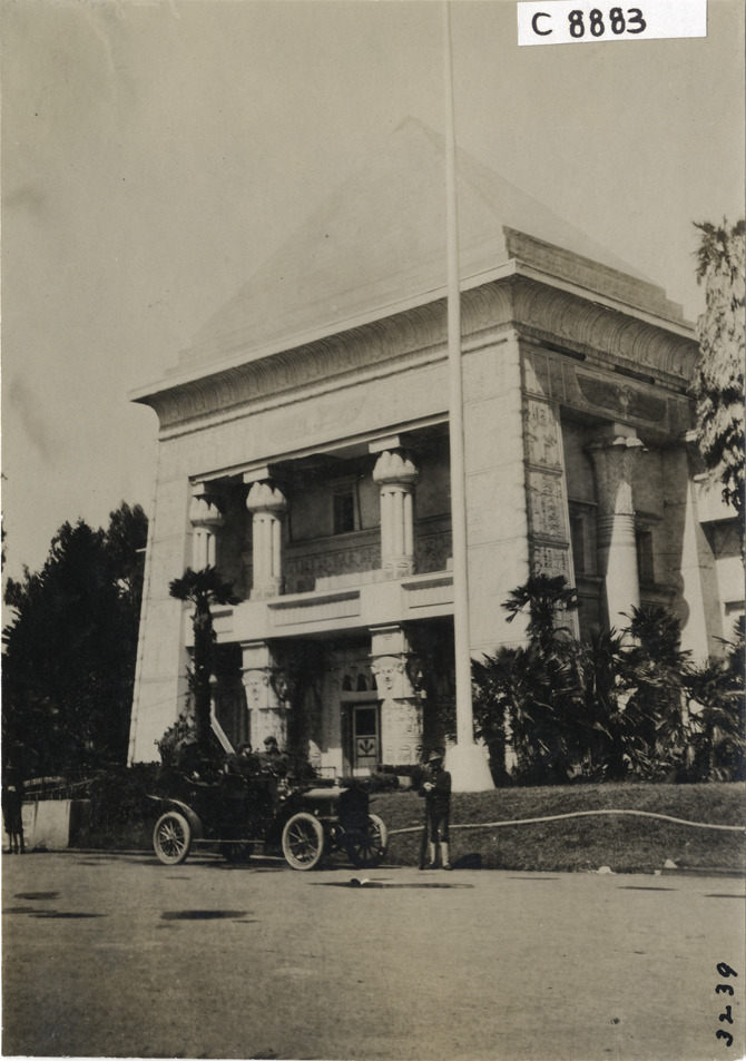 View of men with car in front of Golden Gate Park Memorial Museum during aftermath of 1906 earthquake and fire in San Francisco, California. Stamped on back: "Photo by N. Lazarnick, 29 West 42nd Street, New York." Handwritten on back: "Earthquakes--San Francisco, 1906. The Museum."