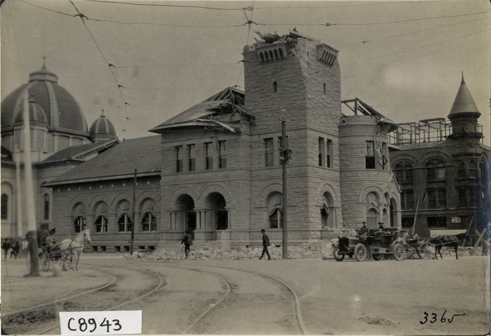 View of damage to Richardsonian Romanesque style San Jose Post Office during aftermath of 1906 earthquake and fire in San Francisco, California. Car, horse-drawn wagons and pedestrians in street. Handwritten on back: "Earthquakes--San Francisco, 1906."