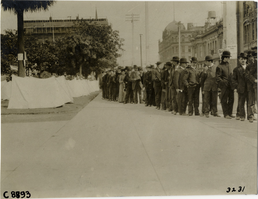 Queue of men and women waiting for passes, 1906 San Francisco earthquake and fire