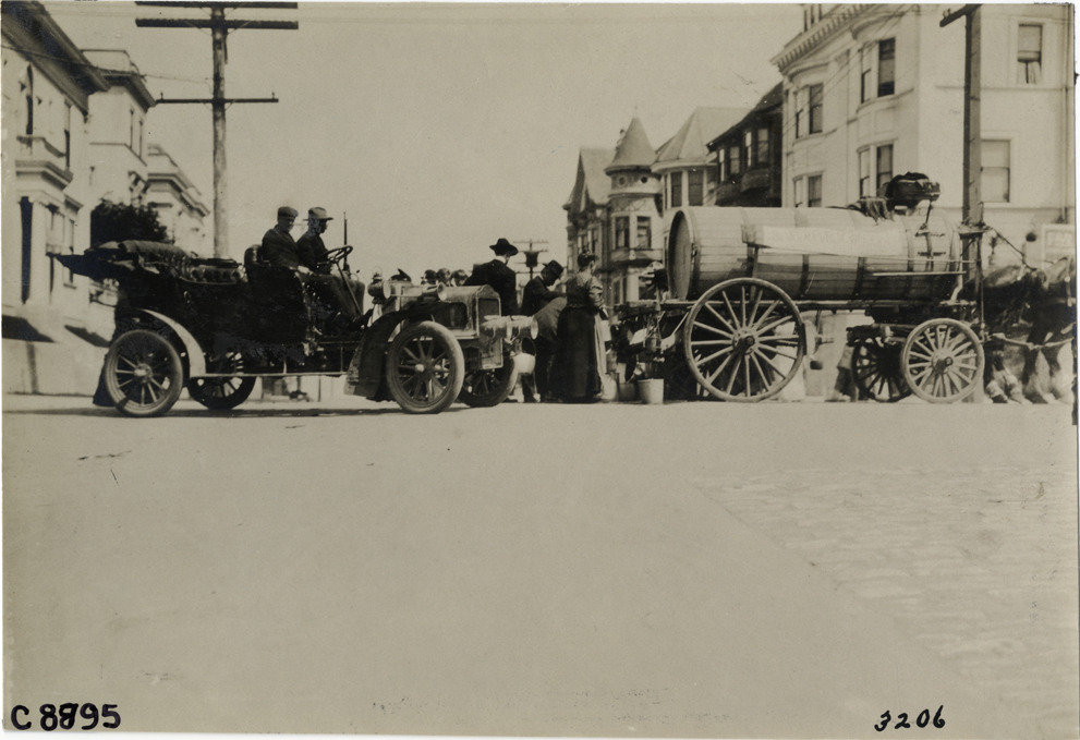 View of motorists in White car parked adjacent to men and women obtaining water from horse-drawn water wagon during aftermath of 1906 earthquake and fire in San Francisco, California. Sign on wagon: "Board of Public Works." Handwritten on back: "Earthquakes--San Francisco, 1906. The White beside the water wagon."