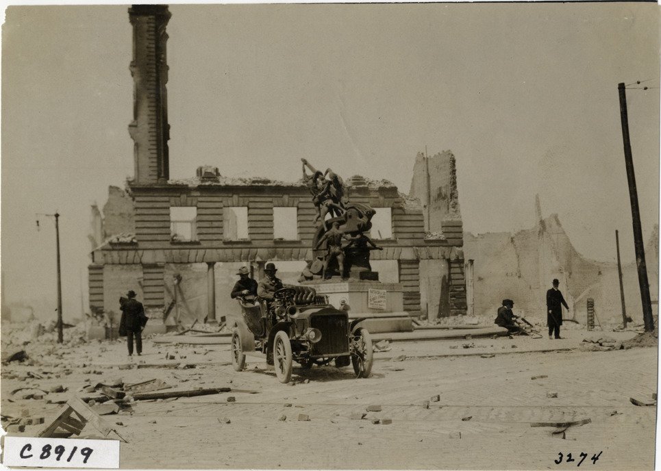 View of motorists in car parked in front of Mechanics' Monument, also known as the Donahue Memorial Fountain, during aftermath of 1906 earthquake and fire in San Francisco, California. Damaged building in background. Stamped on back: "Photo by N. Lazarnick, 29 West 42nd Street, New York." Handwritten on back: "Earthquakes--San Francisco, 1906. The Mervin [sic] Donahue monument on Market St."